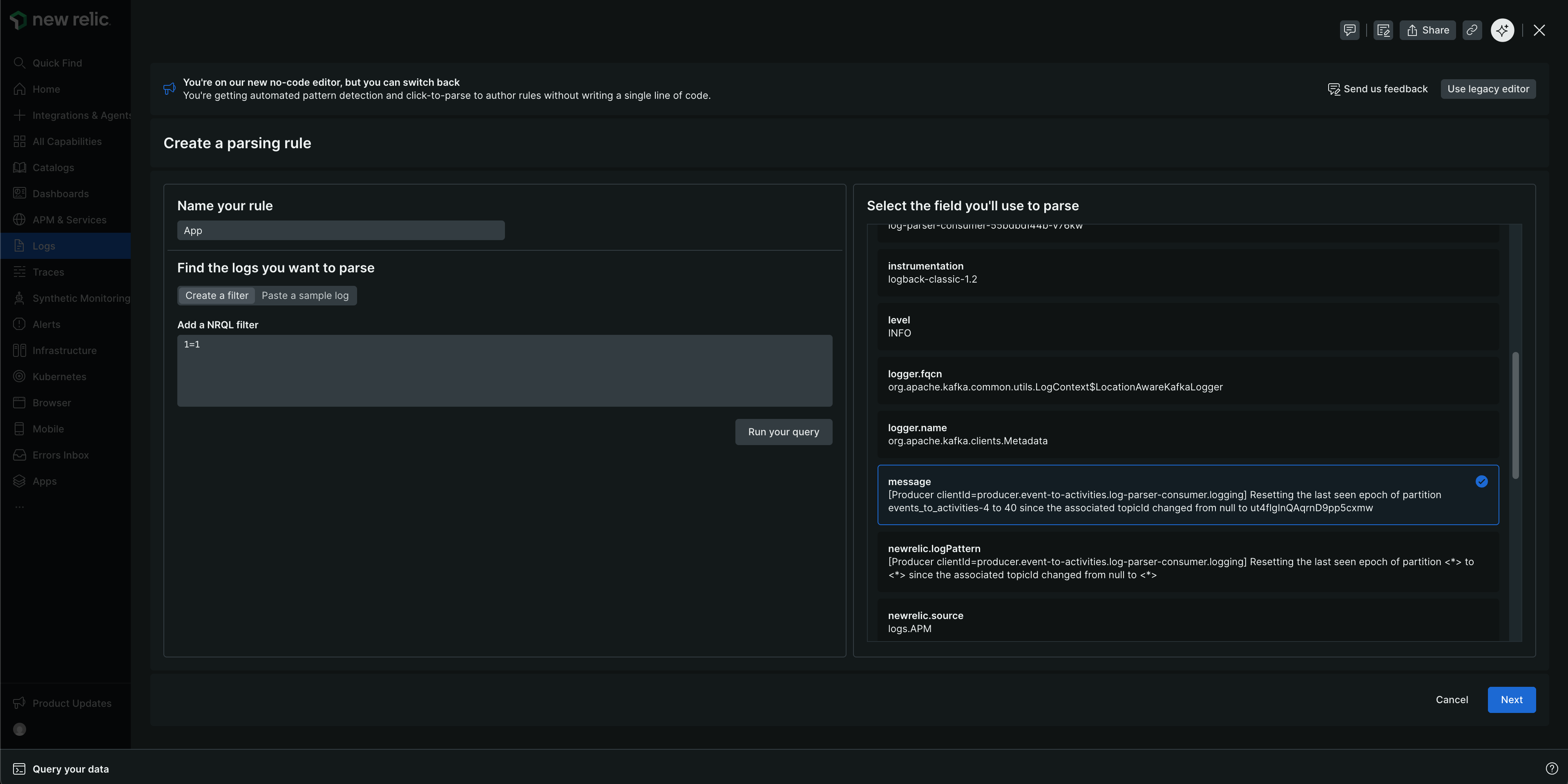 • Si vous collez un exemple de log, vous devez définir la clause NRQL WHERE pour correspondre à vos logs, sélectionner le champ que vous souhaitez analyser et cliquer sur Next.