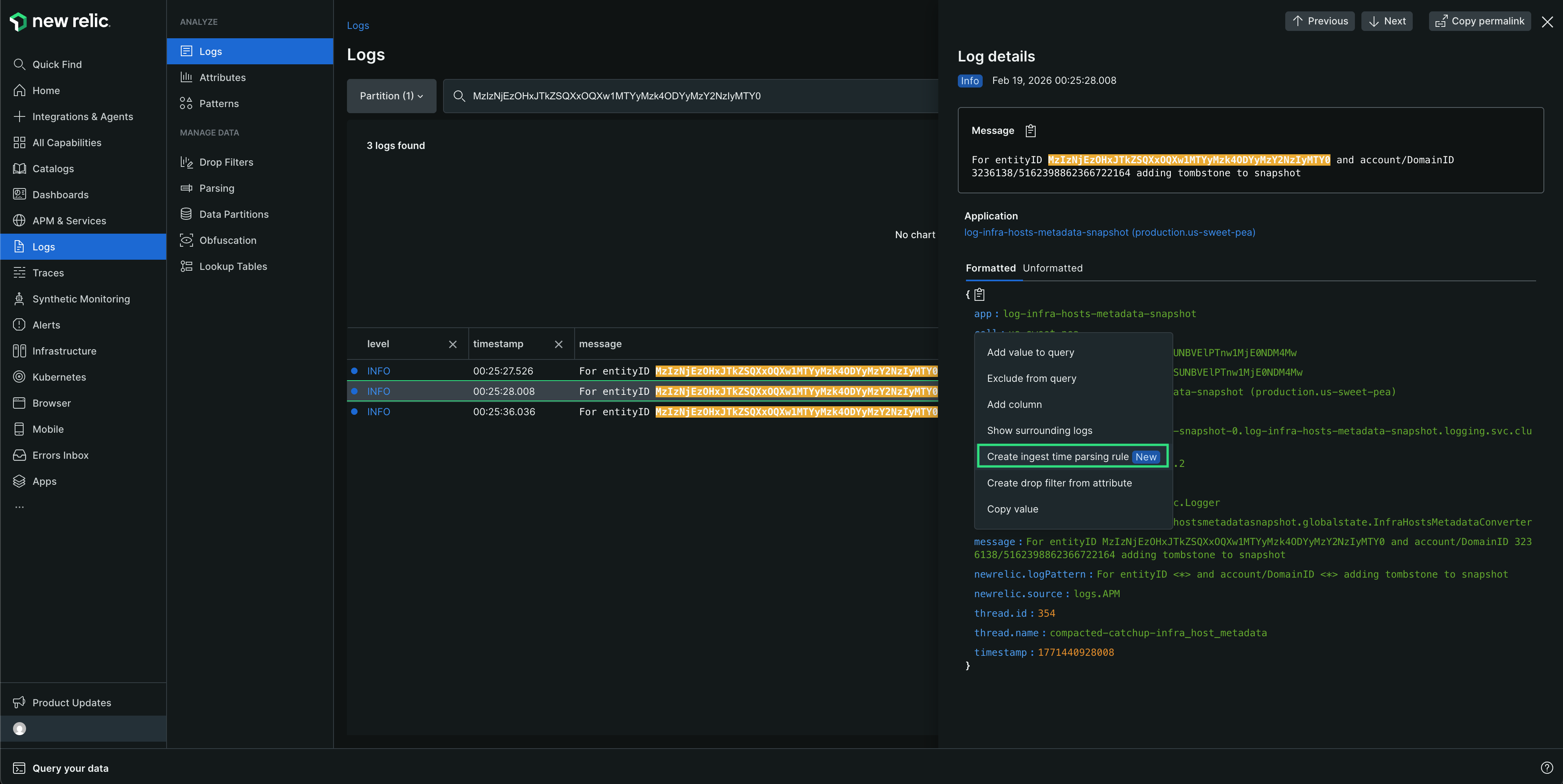Pour créer une règle en contexte, allez dans one.newrelic.com > Logs et appliquez un filtre (ou sélectionnez une entité disposant de logs, telle que APM, Browser ou Mobile, et accédez à Logs in Context).