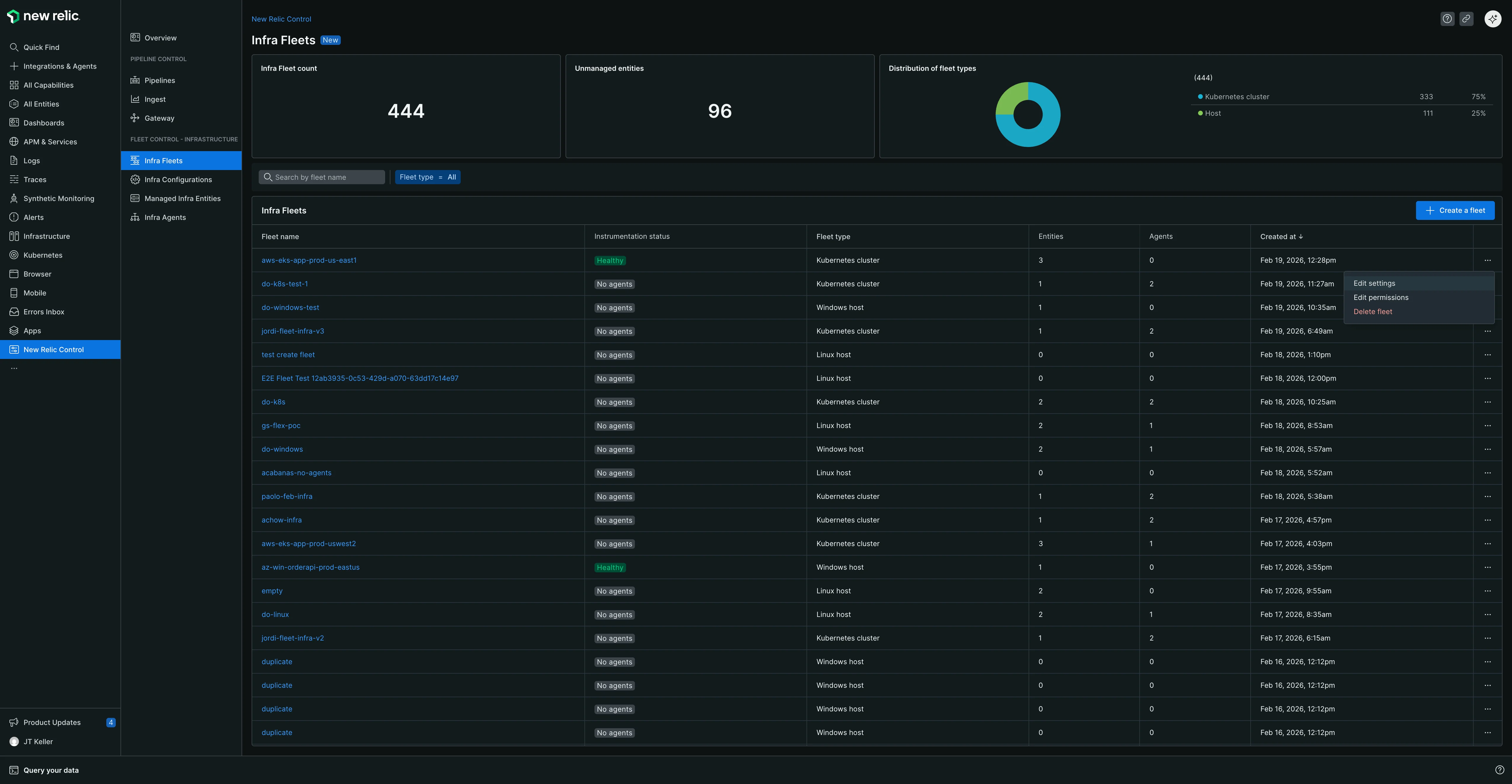 Lorsque vous accédez à New Relic Control → Fleets, vous arrivez sur la page principale Fleets, qui fournit une vue d'ensemble de l'intégralité de votre environnement Fleet Control. À partir d'ici, vous pouvez :