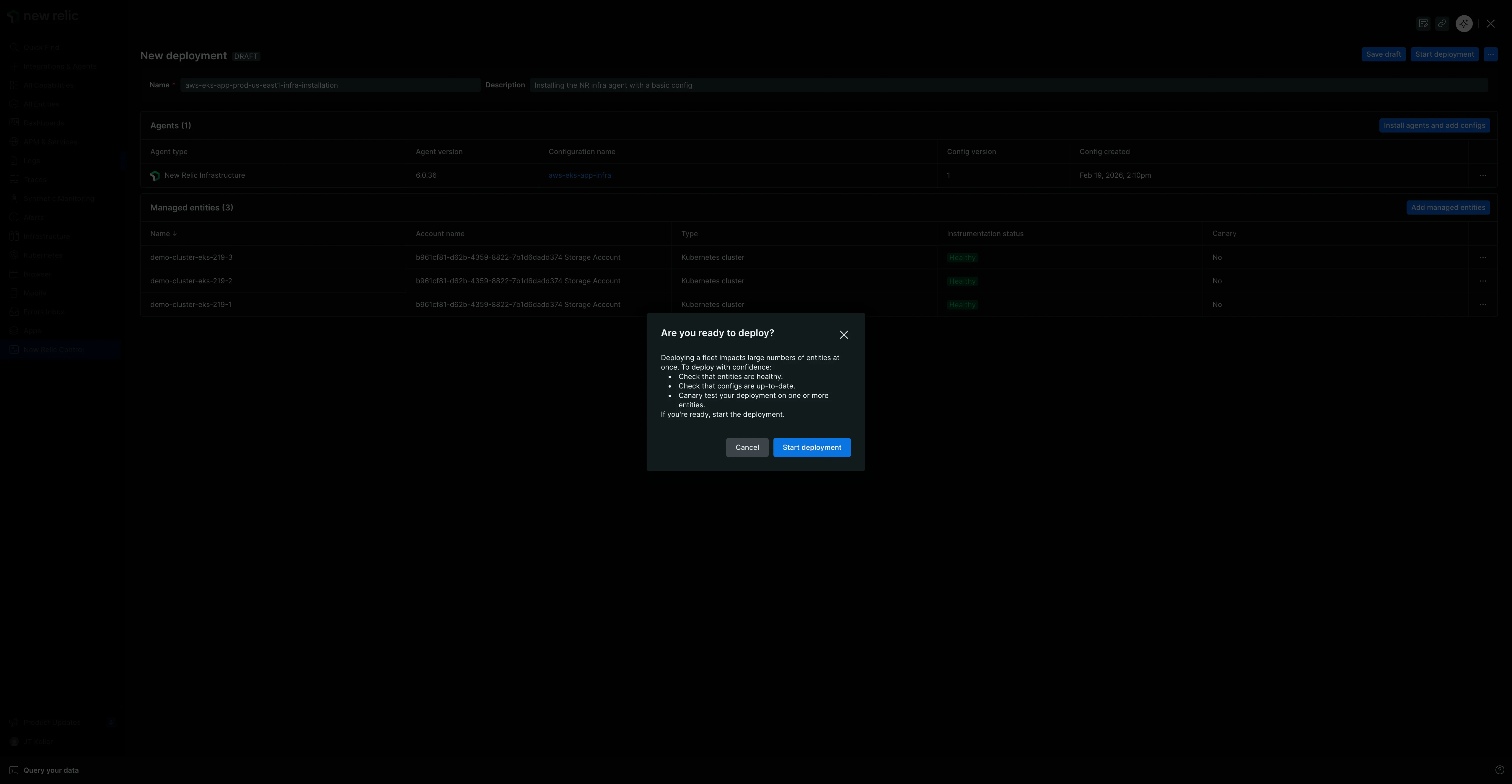 Un déploiement est un ensemble contrôlé d’actions qui peuvent installer, supprimer ou configurer des agents sur l’entité gérée de votre flotte. Vous allez maintenant en créer un pour déployer l’agent New Relic Infrastructure.