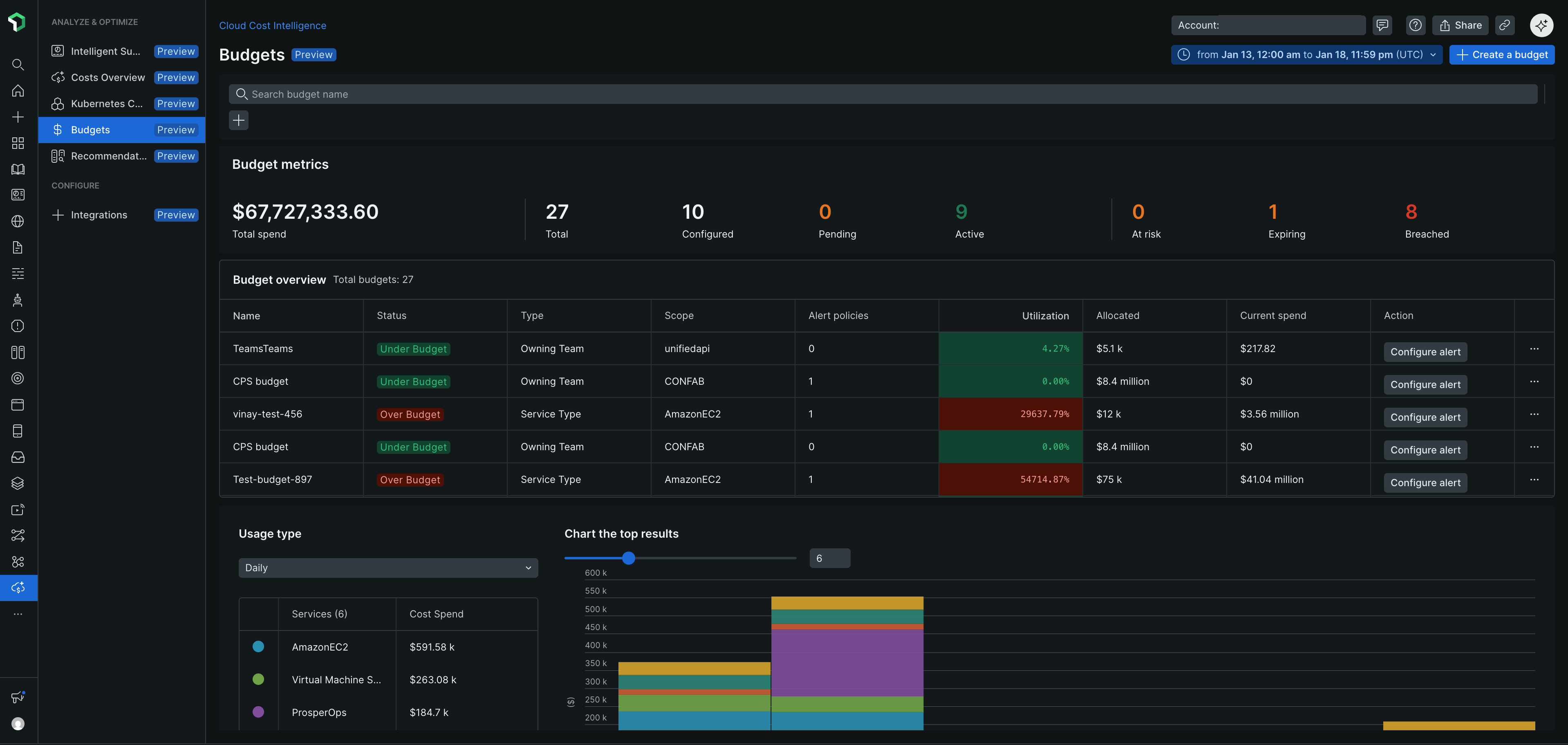 予算は、1 か月から 12 か月までの柔軟な期間にわたってアカウントの支出限度額を設定します。事前定義された制限に照らしてcloud支出を監視することで、クラウド支出を管理するのに役立ちます。